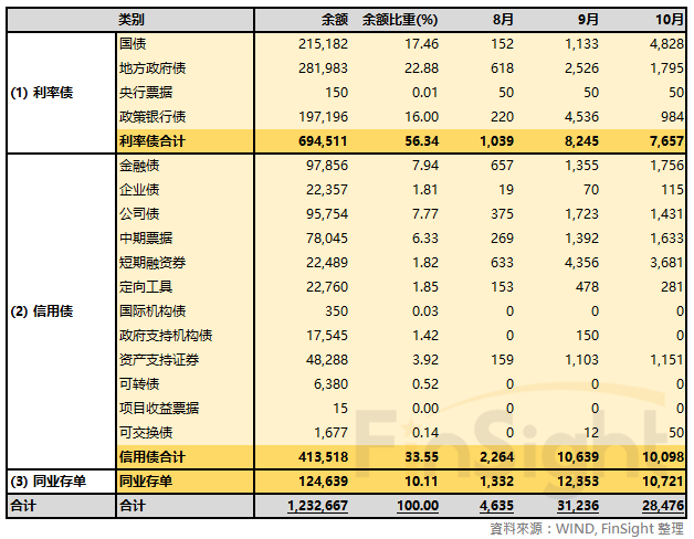 目前中國債務存量 123.25 兆人民幣,其中利率債佔 56%、信用債 34%、同業存單 10%。利率債主要是指國債、地方政府債券、政策性金融債和央行票據,而信用債則是指政府之外主體發行的本息償付現金流債券。