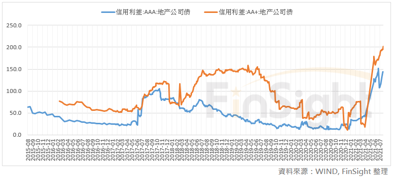 在這種背景之下,現金流穩健、風控優異的龍頭房企可望大者恆大,但債務狀況不佳的公司將面臨資金面上的巨大壓力。以現階段的房地產信用利差來看,四月之後,無論是 AAA 或是 AA+ 都持續走高。
