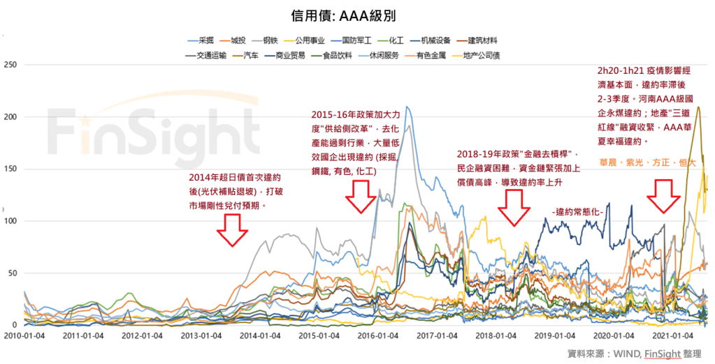 若以中國信用債的「信用利差」作為指標,回顧歷次信用利差飆升的時期。可以看到 2015~2016 年的供給側改革、2018~2019 年的金融去槓桿都使當時的信用利差升高,雖然使營運狀況不佳、現金流出問題的企業逐步違約,但也使營運優異的企業取得更大的市場,創造更健康的經營環境。