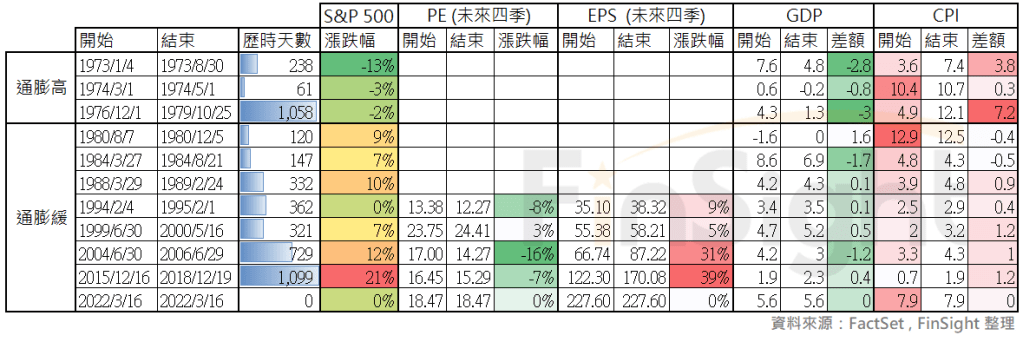 如果搭配總體的數據,可以發現這兩個時間的基本面狀況差很多,其中最大的差異就來自於通膨是否位於高檔區。以 1970 年代為例,升息時大多遇上相對強勁的通膨,同時在升息期間,CPI 維持高檔,而 GDP 卻是逐步走弱。