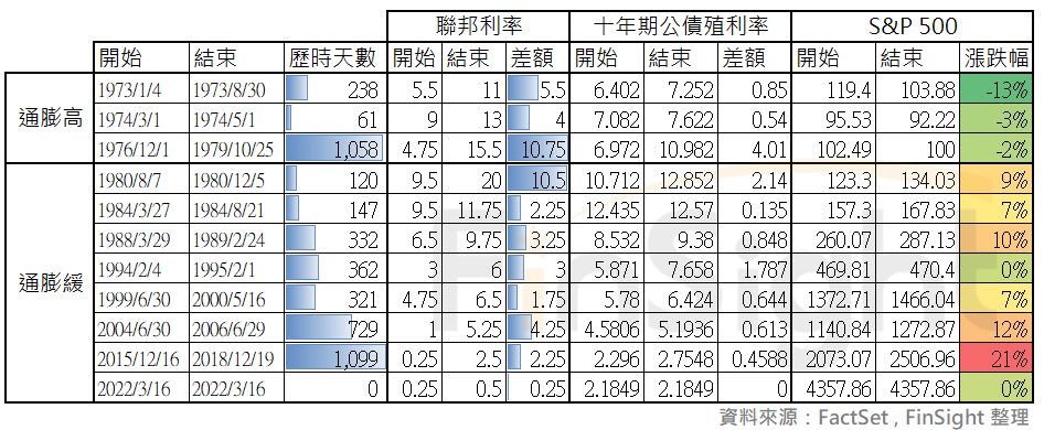 回顧美國聯準會升息歷史,自 1970 年之後共有以下 11 次主要的升息循環,其中根據通膨狀態主要分成兩個時期,分別是 1970 年代,還有 1980 年之後。其中 1970 年代的升息是因為通膨驅動,整體股價表現不佳;但 1980 年後的通膨多數壓在 5% 以下,聯準會升息腳步可以根據經濟狀況調整,因此後續多為多頭的景氣行情。