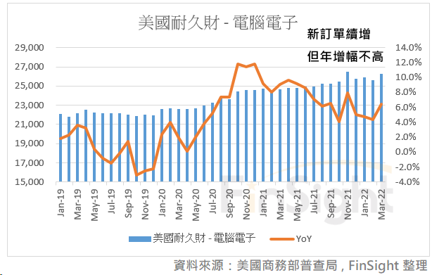 而企業用的雲端需求還是穩健,美國耐久財中的電腦與電子產品最新一個月數據仍在新高附近,只是年增幅不像去年那麼高。但還是要留意,當未來企業獲利開始下調、在手現金流逐漸變少時,也會影響到企業的資本支出,但這件事情應該會在兩季之後才比較明顯,目前還沒有明顯鬆動。