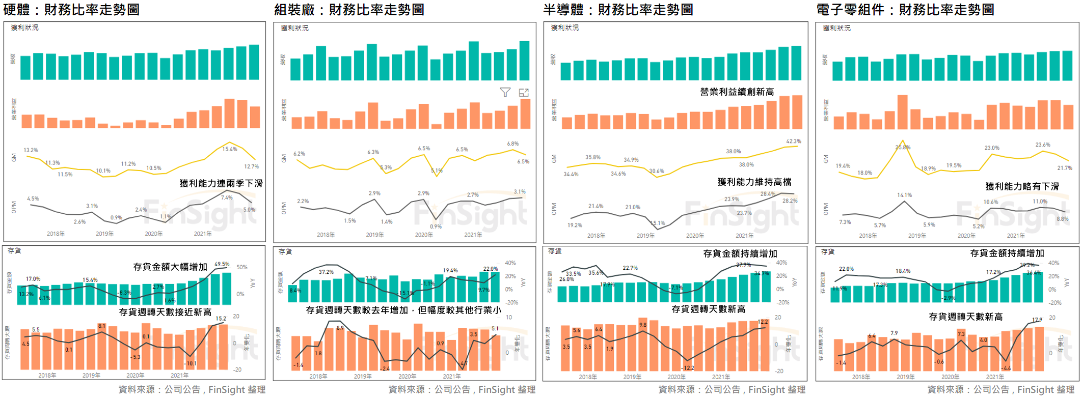 - 半導體:存貨金額持續創新高,週轉天數接近2019年高點,但整體獲利能力仍最優異。
