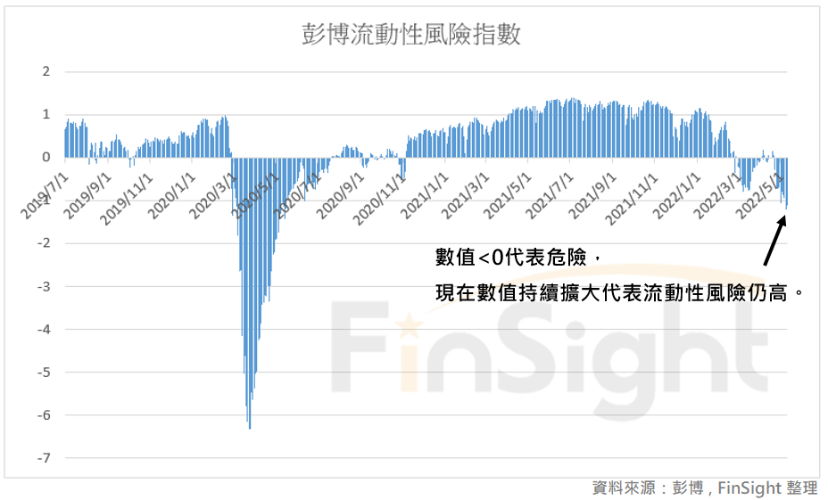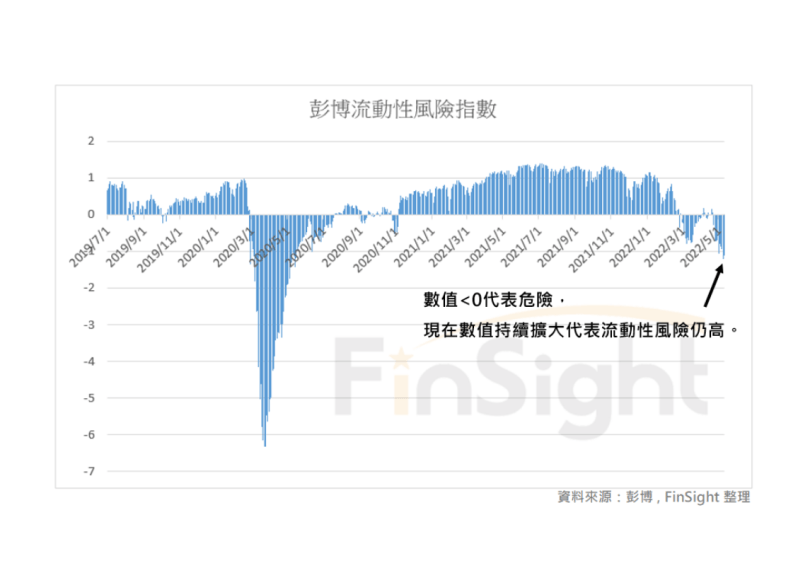 而先前也給大家看過,跟蹤美國貨幣、債券和股票市場的整體金融壓力指標:彭博金融狀況指數,在三月開始出現 Z-score 小於零的值。而這個數據在本周正式跌破 -1,代表現在金融壓力處於非常極端的狀況。在整體金融條件收緊的情況下,「流動性」問題一定要高度重視。