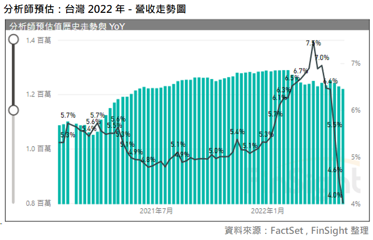 同時,雖然整體基本面下修幅度不大,但已經不像過去兩年持續上修。參考 FinSight 整理的台灣分析師預估值走勢圖,我們可以看到分析師對 2022 年的營收預估在這幾周逐步下調。