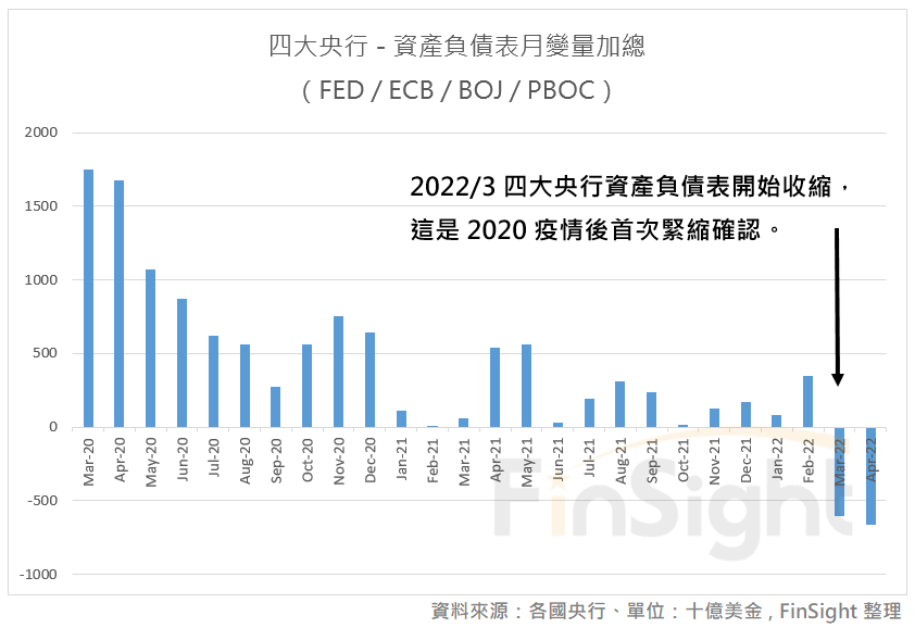 三月開始,各大央行從寬鬆轉向緊縮。我們從四大央行資產負債表的月變量來看,從三月起已經明顯收縮,這是自 2020 開啟巨量寬鬆後的首次緊縮,象徵著央行為對抗通膨,正式進入資金緊縮時期。在這樣的時期下,資產評價不易走高,PE 修正風險仍在。