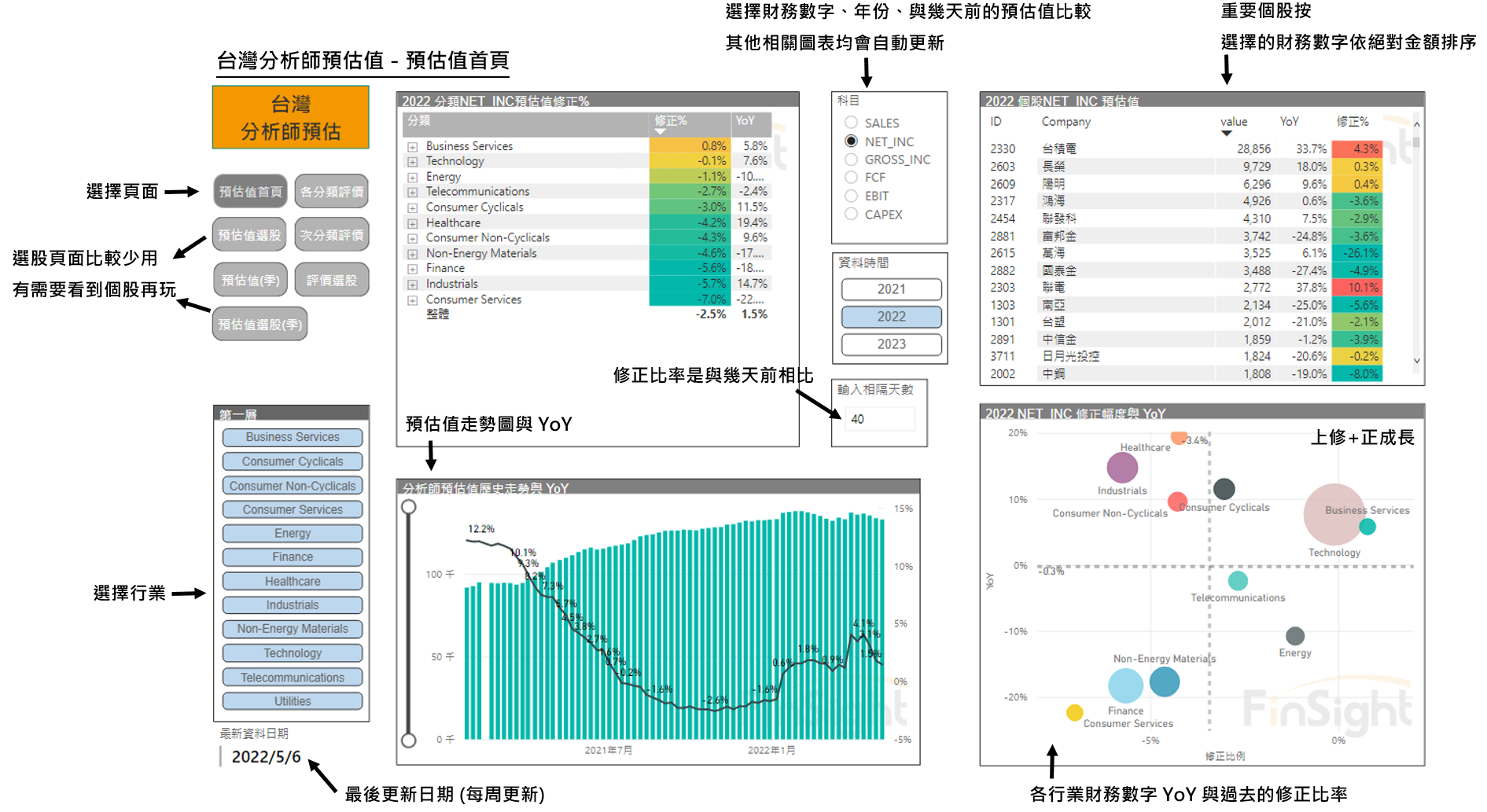 點進台灣分析師預估值模板後,可以看到首頁上面有非常多不同的財務數字與年度可以選擇,當點選完想看的財務數據後,其他圖表也會跟著一起變動。裡面我最常看的就是營收與獲利過去每周預估值的變化趨勢,每次更新主要就是看下面中間的圖表變化。。