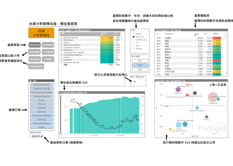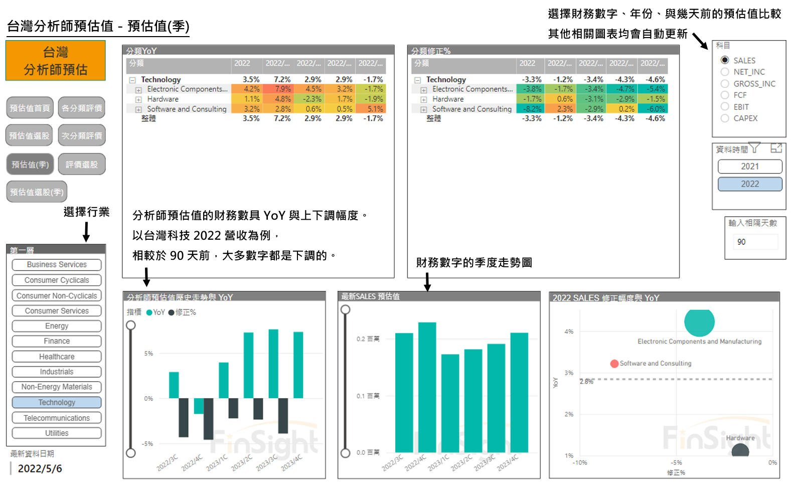 知道了哪些行業最強,就可以來到預估值選股的頁面,看看在該分類之下,不同企業表現的狀況。在這一頁中,可以以橫向的方式來看不同產業,當選定想看的次行業後,就能觀察該行業各股財務數字 YoY 與修正比率。