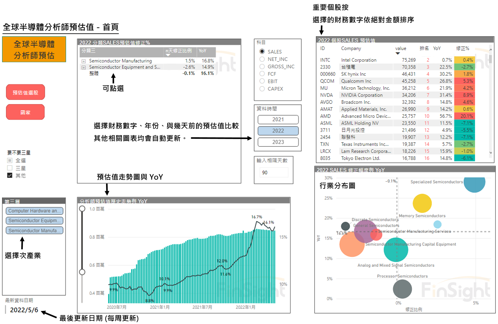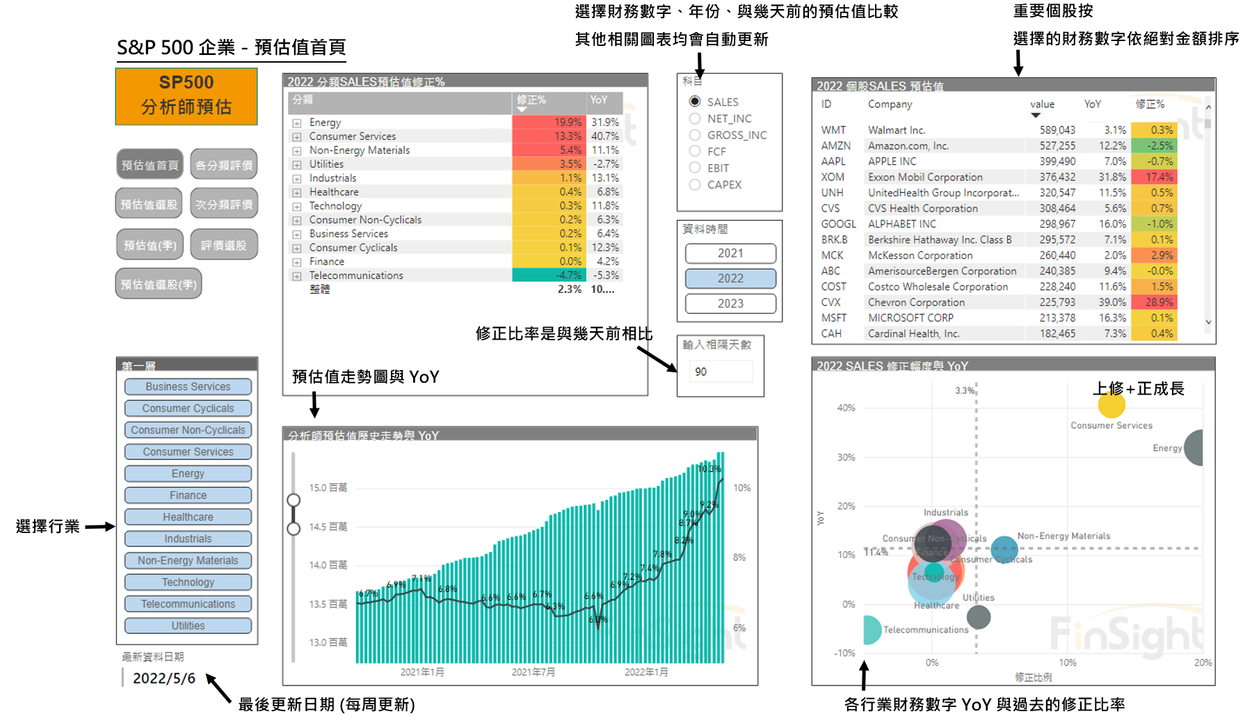 目前分析師預估值模板主要整理 S&P 500、全球半導體、台灣上市櫃,整理這些數據主要是為了自己研究,可以看到市場分析師對企業的獲利預估共識,提供不同角度的分析。