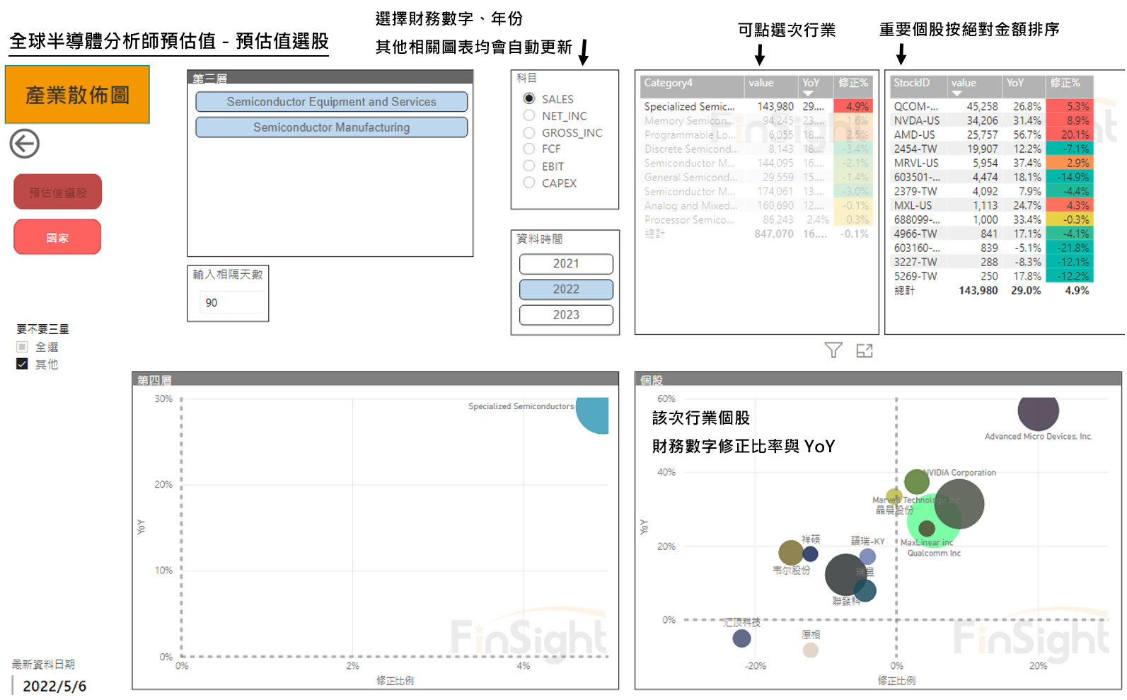 這裡我將 FactSet 定義歸屬於半導體行業中的個股納入,但刪除沒有分析師預估值的標的。半導體分類都可以再往下展開至次行業,當點選相關行業時,下方圖表也會跟著一起變動,這種方式可以看到目前在次行業中最強的族群在哪。