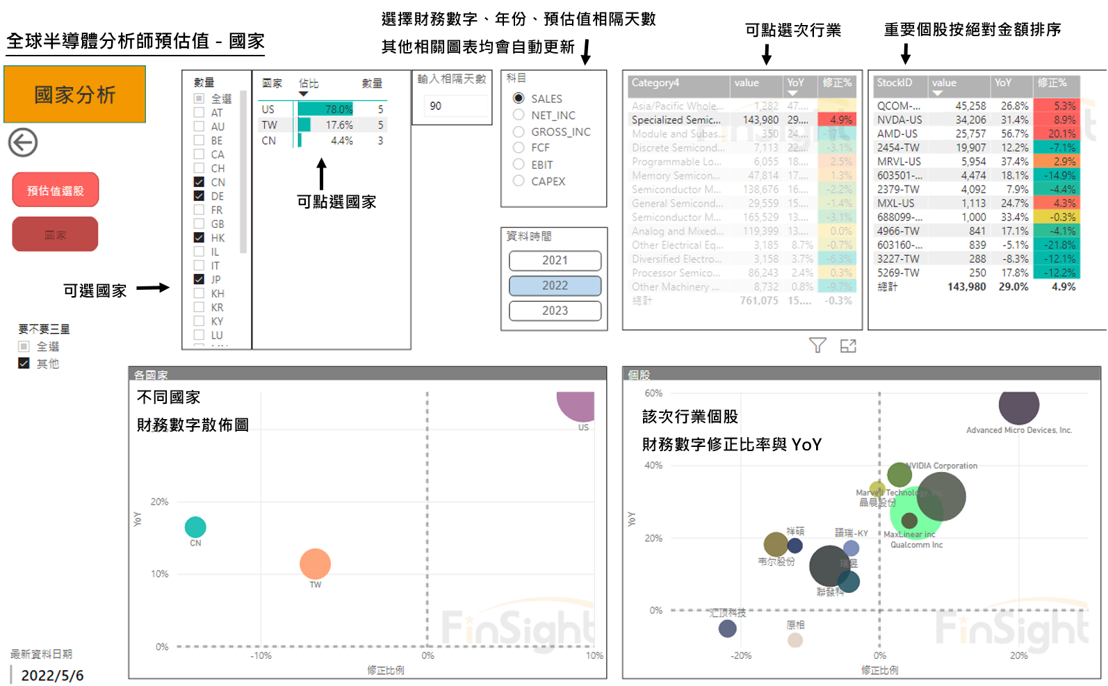 而半導體之於各國,也都是一種國力展現。從國家分析頁面中,可以看到不同國家的財務數字變化。