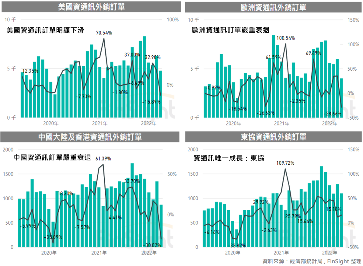 我將「資通訊」外銷訂單的四個主要市場拿出來看,發現美國、歐洲、中國都呈現明顯衰退,唯有東協動能維持。這顯示「資通訊」訂單的弱化,是廣泛來自多地區,並不是好的訊號。