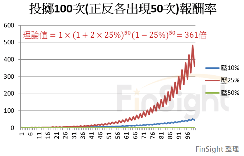 - 壓 25%:根據凱利公式計算,用最適當的資金比例下注,資產成長最快。