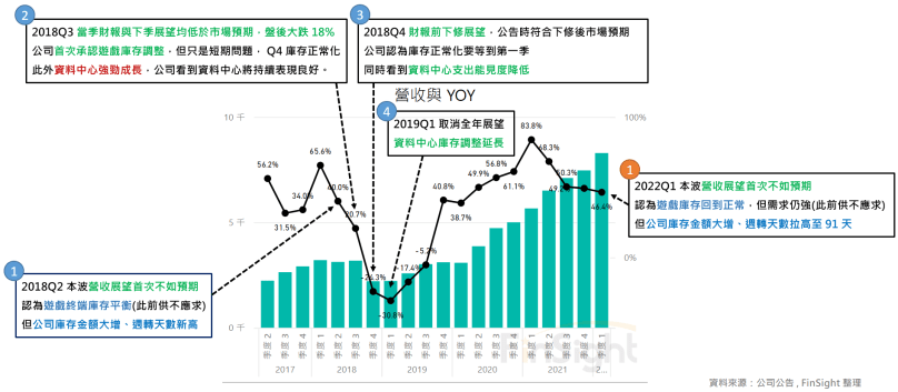 2022Q2:提前財報預警,2022Q2 營收大幅不如市場預期 17%,QoQ 下滑 19%、YoY 3%。 - 遊戲正式進入劇烈的庫存調整,營收大幅不如預期。