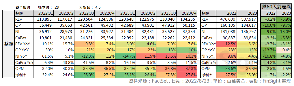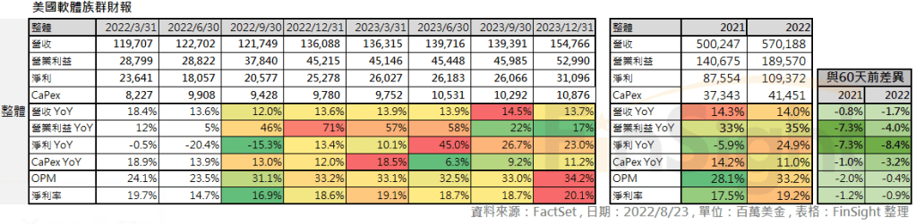 整理了最新分析師預估的財務表現後,發現情況不容樂觀。與 60 天前尚未公告財報的時間點相比,本季財報公告之後,無論是大型雲端公司還是美國軟體股的 2022 與 2023 淨利,都較先前下修 7~10%。尤其是這兩者今年淨利成長正式轉負,雖然目前看不到資本支出被明顯下調,但獲利能力轉差一定會影響到未來投資速度。