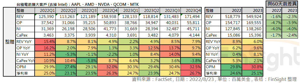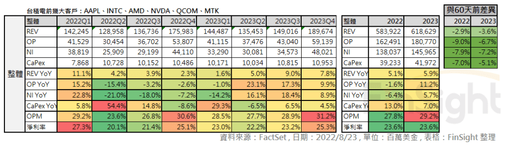 到底台積電在這次庫存調整能否獨善其身?可以來看看大客戶的業績表現。台積電先進製程占比過半,以去年公司年報公告的前兩大客戶佔營收比重達 26%、10% 來看,Apple、Intel、NVIDIA、AMD、QCOM、聯發科…等大客戶的營收占比,有可能近台積電營收的 50%。
