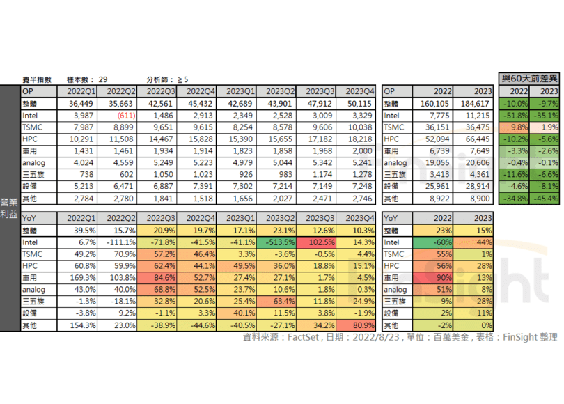 表四:費城半導體營業利益分項 – 分析師預估財報數據並與 60 天前數據比較差異
