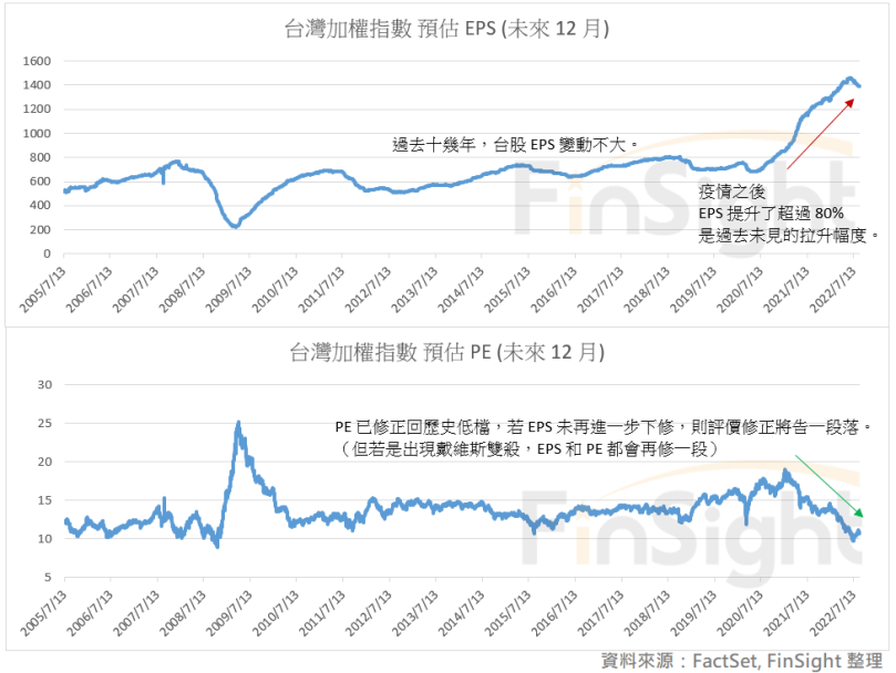 而台灣加權指數在疫情之後,因各種商品漲價與需求暢旺,帶動了 EPS 創紀錄成長超過八成,這在過去是非常難得一見的成長性。但當先前受惠的因素被扭轉時,商品跌價、稼動率下滑、資本支出新增產能並開始折舊,未來的 EPS 下修壓力恐怕會更大。