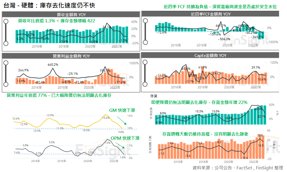 這一季開始聽到部分廠商表示終端通路庫存已下滑,但若是看到台灣跟美國的硬體廠商,則此趨勢並不那麼明確。以台灣電腦與存儲終端品牌為例,雖然硬體庫存金額有下滑,但整體週轉天數還是偏高,只能說沒有再惡化,還沒看到顯著好轉訊號。