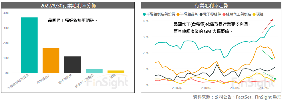 上季看到行業利潤往晶圓代工傾斜,而這一季財報顯示此趨勢更加明顯。上季認為庫存去化壓力極高的硬體與半導體晶片,本季毛利率都往下探(降價銷售),與此同時晶圓代工受到台積電影響,毛利持續走高,使整個行業的微笑曲線