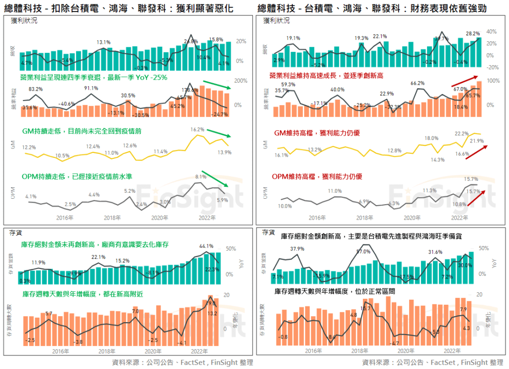 而兩者差異最大的主要在「獲利趨勢」與「庫存水位」。扣除大公司後的台灣科技股,不僅毛利率走低,營利率更是已接近疫情前的水準,庫存週轉天數明顯跳升。而台灣前三大科技股,則是呈現營收、營業利益、毛利、營利率的向上趨勢,庫存週轉天數也維持於正常區間。
