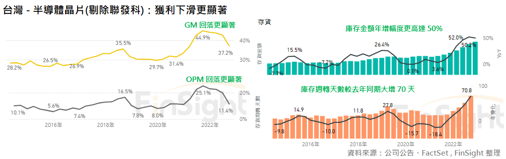 扣除台積電則毛利已經開始回落,成熟製程相關需求會先行調整,目前週轉天數持續創新高,需要留意。