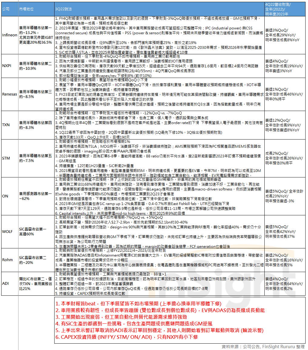 這季比較不同的是各家公司有一些各自的問題,WOLF 因生產與供應鏈挑戰導致營收與毛利下季將下滑,公司執行力出了一些問題,也因為這樣整體獲利的改善會延後幾季,之前法說說的 FCF 目標也會延後;STM 受 2 座新廠影響跟 2023 年訂價不預期繼續漲價,毛利率有逆風;ON 在 2023 年也有毛利率逆風現象,因為 SiC 量產會造成 1-2% 負面影響,還有 0.4-0.7% 來自 East Fishkill fab,且稼動率 UTR 也開始下滑;NXPI 汽車及部分工業產品持續受到產能瓶頸限制 (28/40/55nm),且部分設備延後出貨,調降全年 CapEx/Rev.下修到 8% (前次10%)