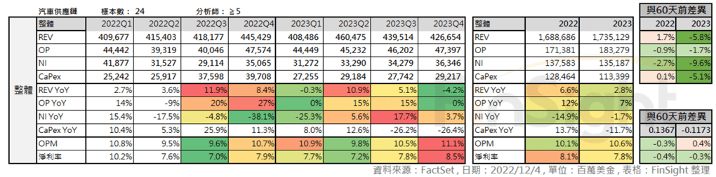 上季提到 OEM 復甦之路一波三折,回顧整年,原本預期要迎來疫情後強勁復甦的車廠,卻因為烏俄戰爭與中國強力的封控政策造成供應鏈問題遲遲無法被解決,不過經過這幾季的調整,這季財報多優於預期,財務數字沒有再下修。