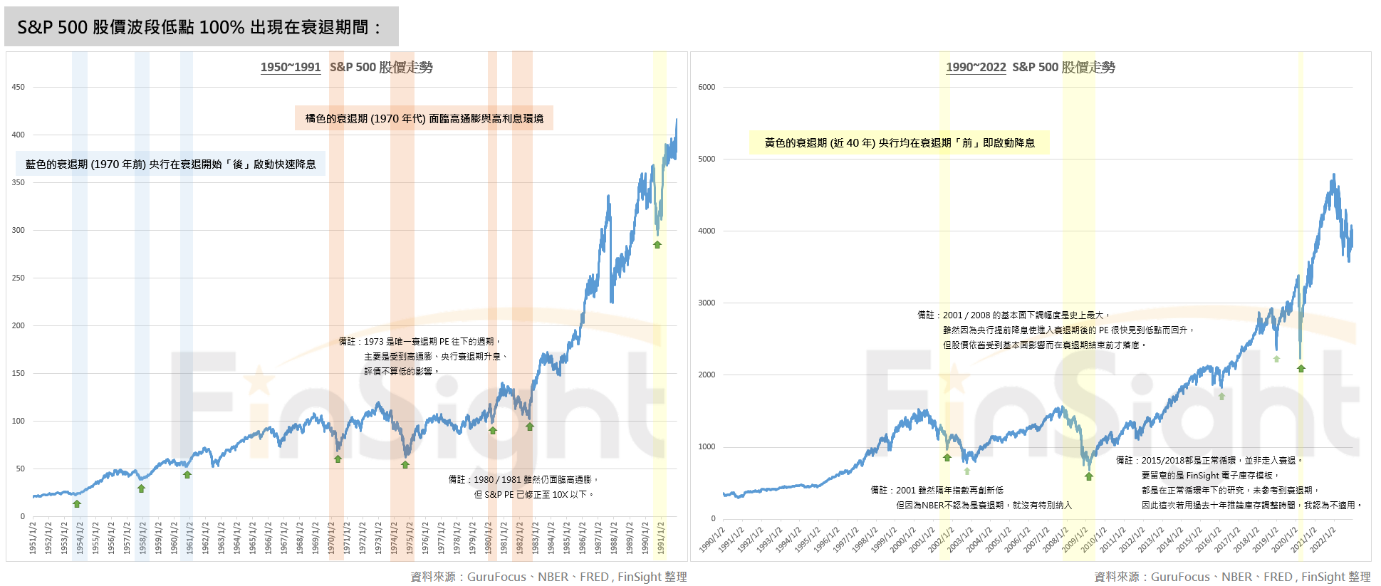 回顧過去衰退期,股價波段低點 100% 發生在衰退期間