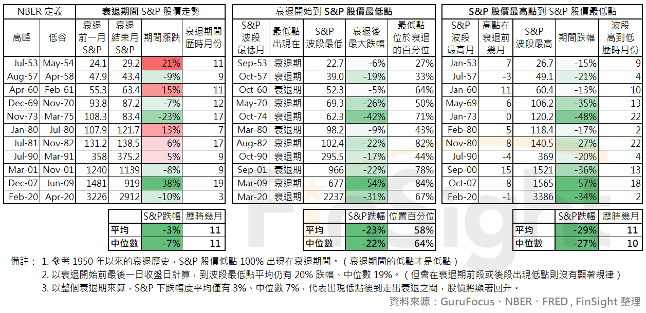 - 從「股價最低點」到「走出衰退期」股價將顯著回升,使整個衰退期的 S&P 跌幅從最大平均 -22% 收斂至平均 -3%(中位數從 -19% 收斂到 -7%)。