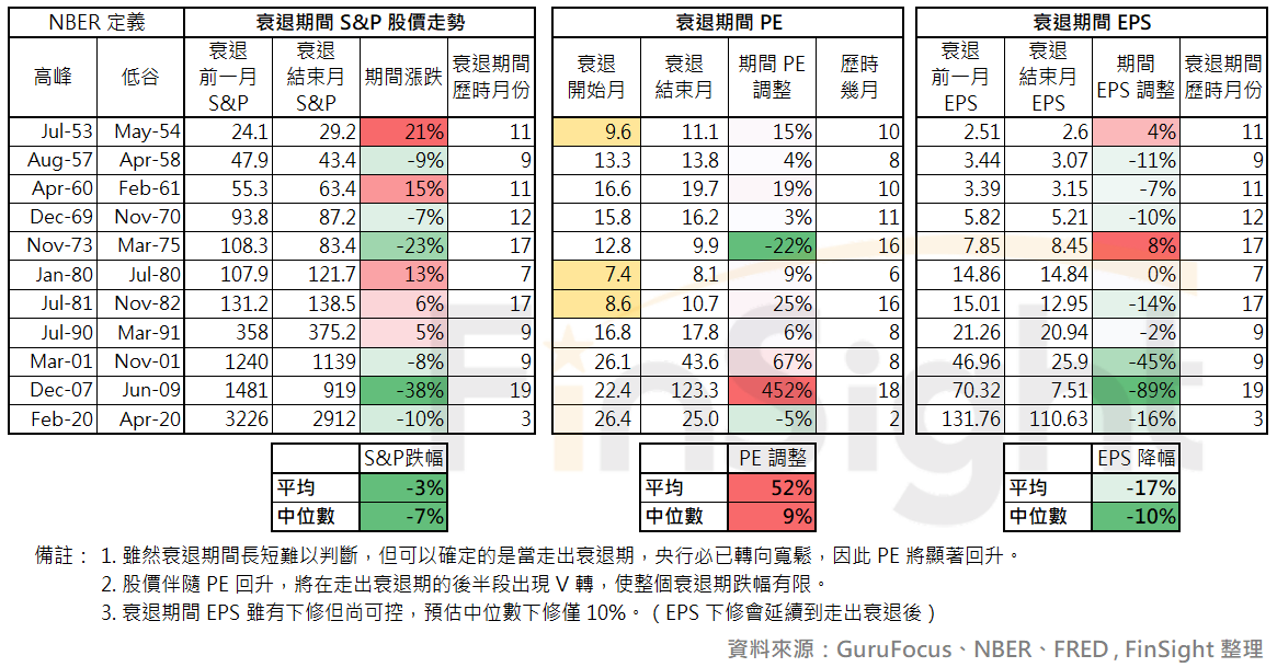 姑且不論今年到底有沒有經濟衰退,我們先看看過去 NBER 定義的衰退期中,股價表現與背後的 PE、EPS 變化。