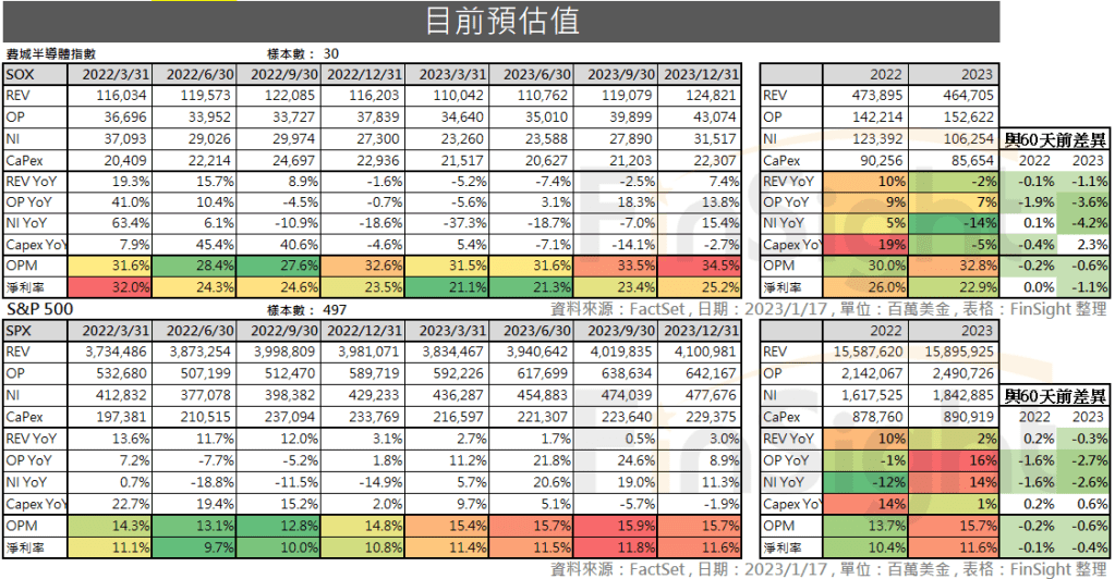 表四:分析師預估 S&P 500 與費城半導體財報並與 60 天前預估值比較