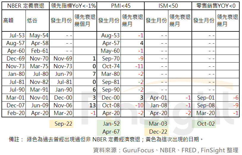 表五:過去經濟衰退期,各項總經數據碰觸到關鍵點位的月份