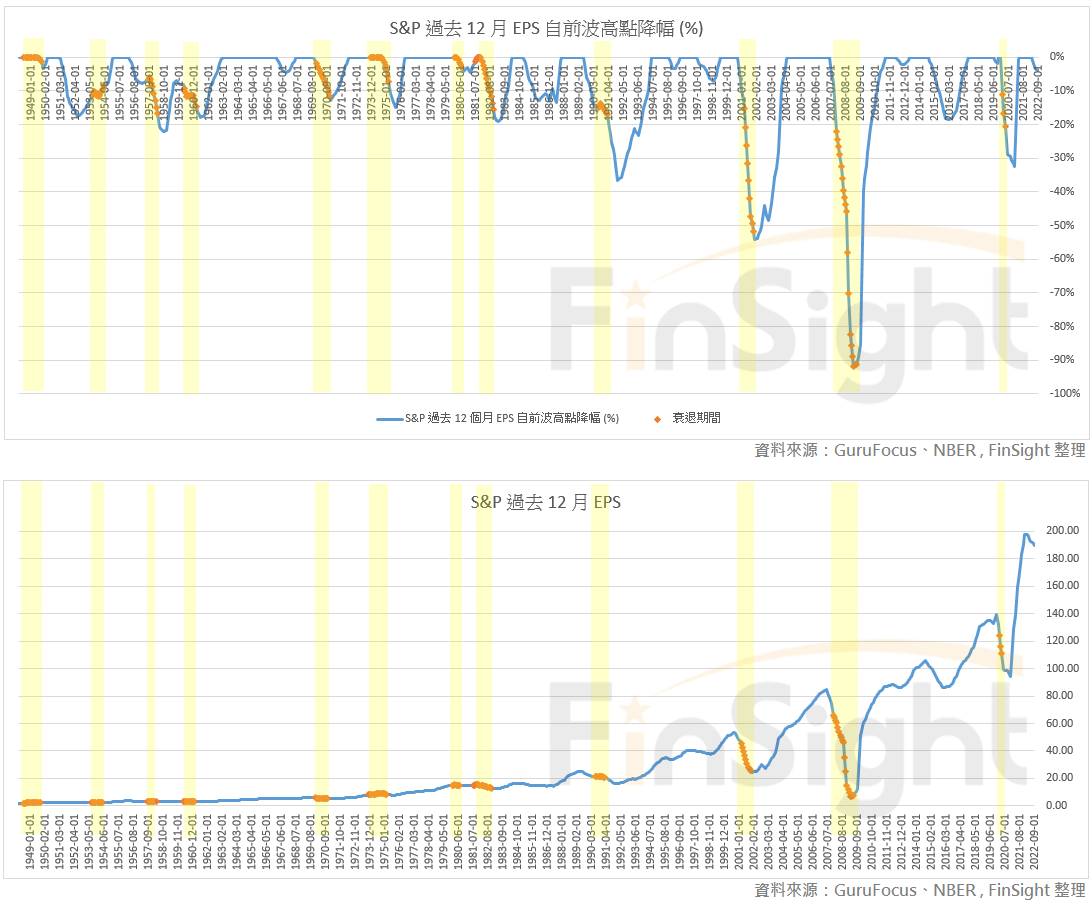 圖一:1952 年以來,過去 12 個月 EPS 自高點降幅與 EPS 走勢(衰退期間標註黃色)