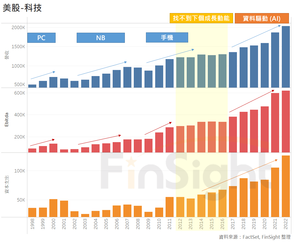 圖一:美國「科技」財報營收、EBITDA、資本支出走勢 – 2017 年後顯著成長