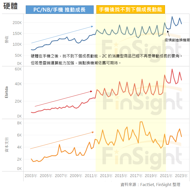 圖二:美國「硬體」財報營收、EBITDA、資本支出走勢 – 手機後找不到下個成長動能(2020 後因疫情導致 WFH 需求而重回成長)