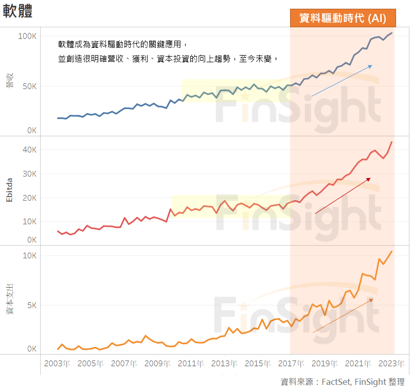 圖四:美國「軟體」財報營收、EBITDA、資本支出走勢 – 2017 年後受惠資料驅動的 AI 時代出現顯著成長