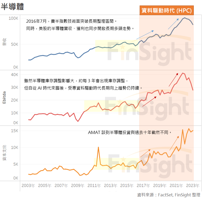 圖三:美國「半導體」財報營收、EBITDA、資本支出走勢 – 2016 年中起受惠資料驅動的 AI 時代而出現顯著成長 (雖有庫存循環但趨勢向上)