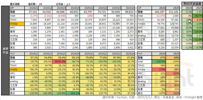 表四:分析師對費半成分股的財報逐季預估 (左),與 60 天前的預估差異 (右) – 2025/5/13 更新