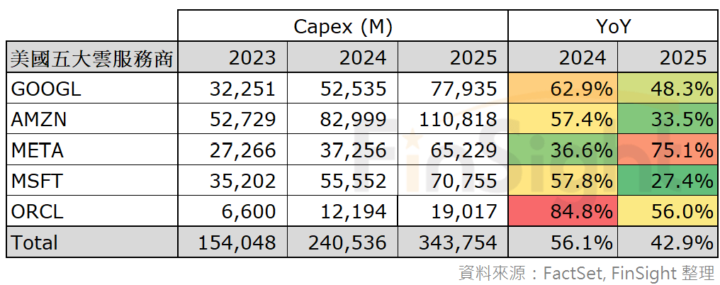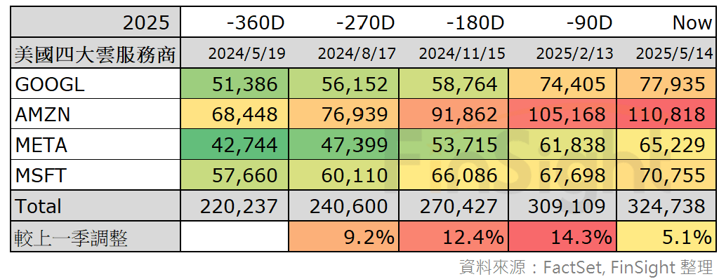表五:主要雲端大廠資本支出歷史數值與分析師預估值 – 2025 YoY 已上修至 42.9%