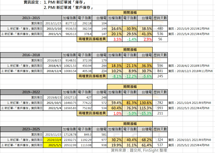 - PMI 新訂單減「庫存」的賣出訊號:出現較早,雖然出現訊號後到低點將歷時 5~12 個月,但可避開的跌幅較大,以電子指數為例,可避開 18~27% 的下跌幅度。