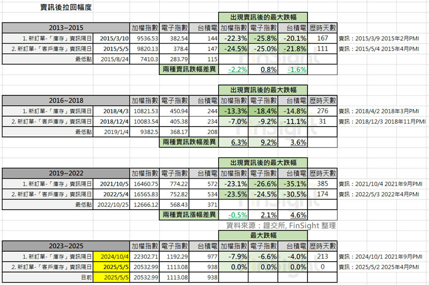 而今年五月初,電子庫存循環設定的最終賣訊受到川普關稅政策影響也出現了,這篇文章將回顧過去最終賣訊出現後的指數走勢,並分析此次與過去不同之處。