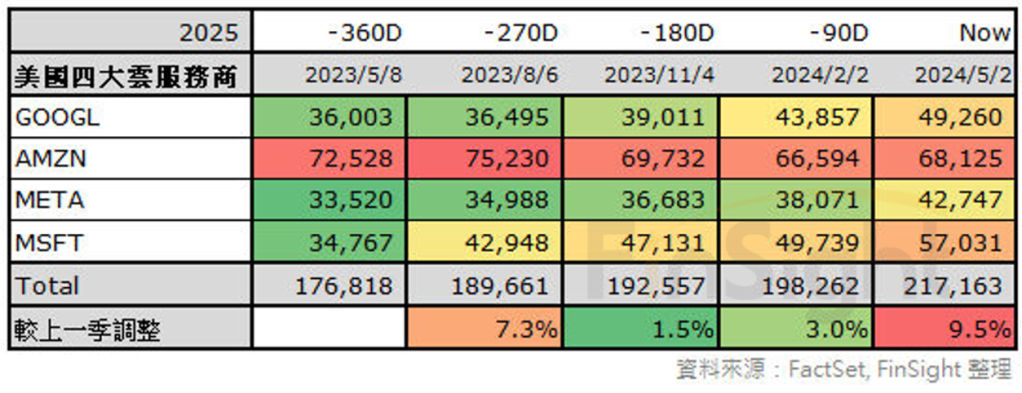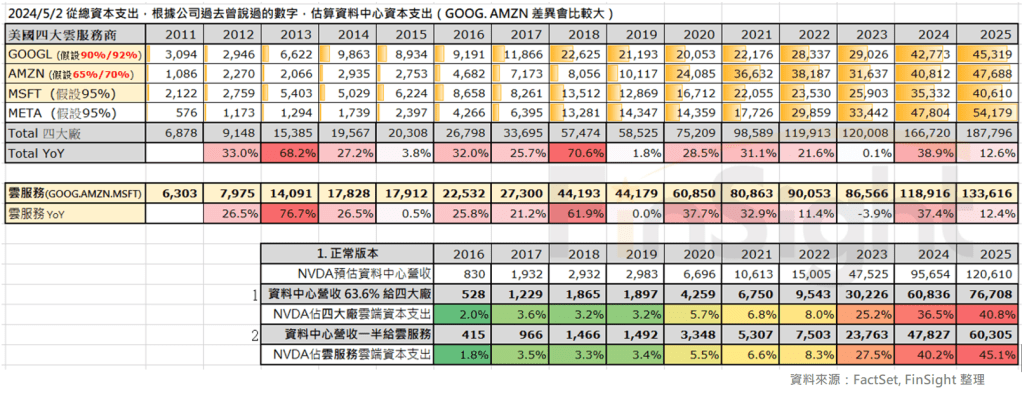 以下調整各大廠資本支出投入在資料中心的比重後重算: