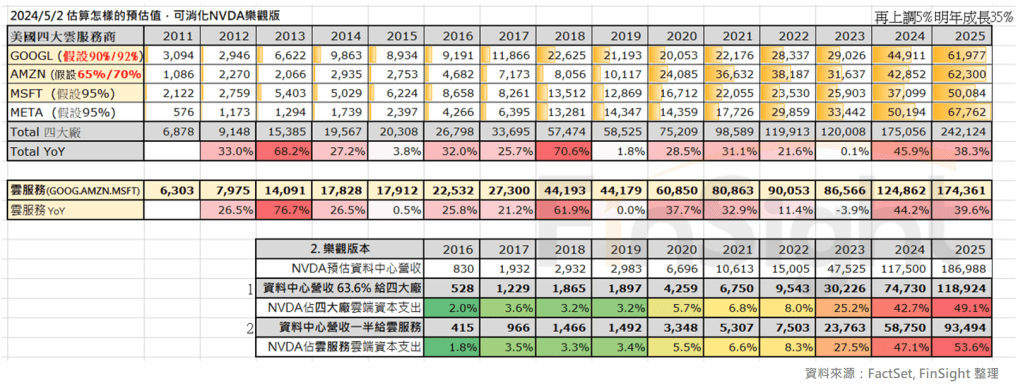 但如果要消化NVDA的最樂觀預期,則資本支出還要再上調,預計今年再上調5%、明年全年成長35%,則可以將NVDA市場預估最樂觀的數值消化。