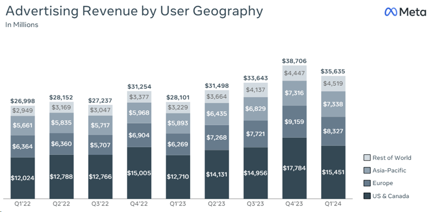 - 區域廣告收入增長以歐洲和其他地區最高,分別達33%和40%,亞太地區次之為25%,北美增長22%。