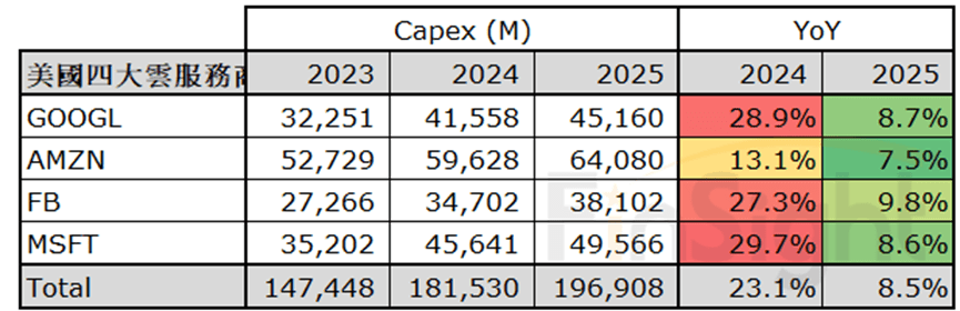 - AI 使資本支出大增,從原本的300-370億美元提高到350-400億美元 (均值上調12%),主要用於支持AI發展的基礎設施投資。