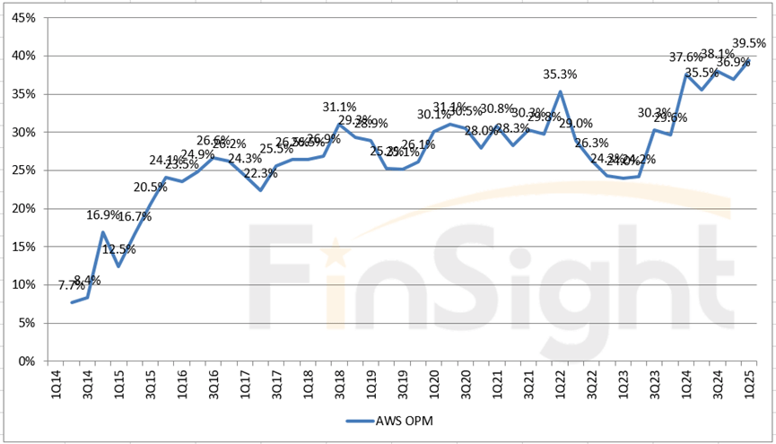 - AWS OPM 大幅提升創歷史新高!接近 40% 且沒有調整會計年度影響。