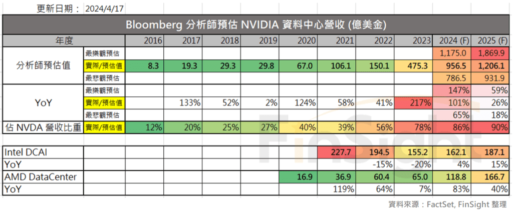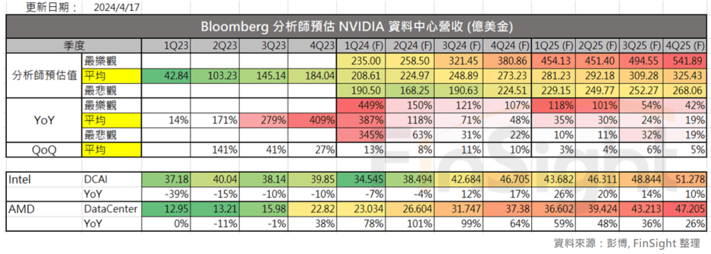 以下是NVIDIA. Intel. AMD 的資料中心業務市場預估值,但需要整體市場的金額我才能再進一步試算,直覺認為Intel預估值太樂觀: