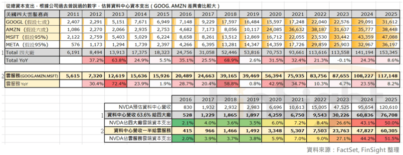 步驟二、以四大CSP業者的CapEx預估值來乘上他們過去曾在法說會說過的「資料中心佔資本支出投資比重」,呈現的數據如下: