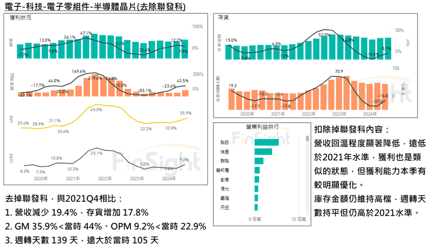 - 大優於小、AI優於非AI:核心幾家大型股(2330.2454.組裝)是帶動獲利回升的關鍵(和AI相關)。若扣除掉這幾家公司,則每個細領域的營收與獲利成長皆不好,和2021年相比的庫存與週轉天數也都還在高檔,OPM則是完全回不去。